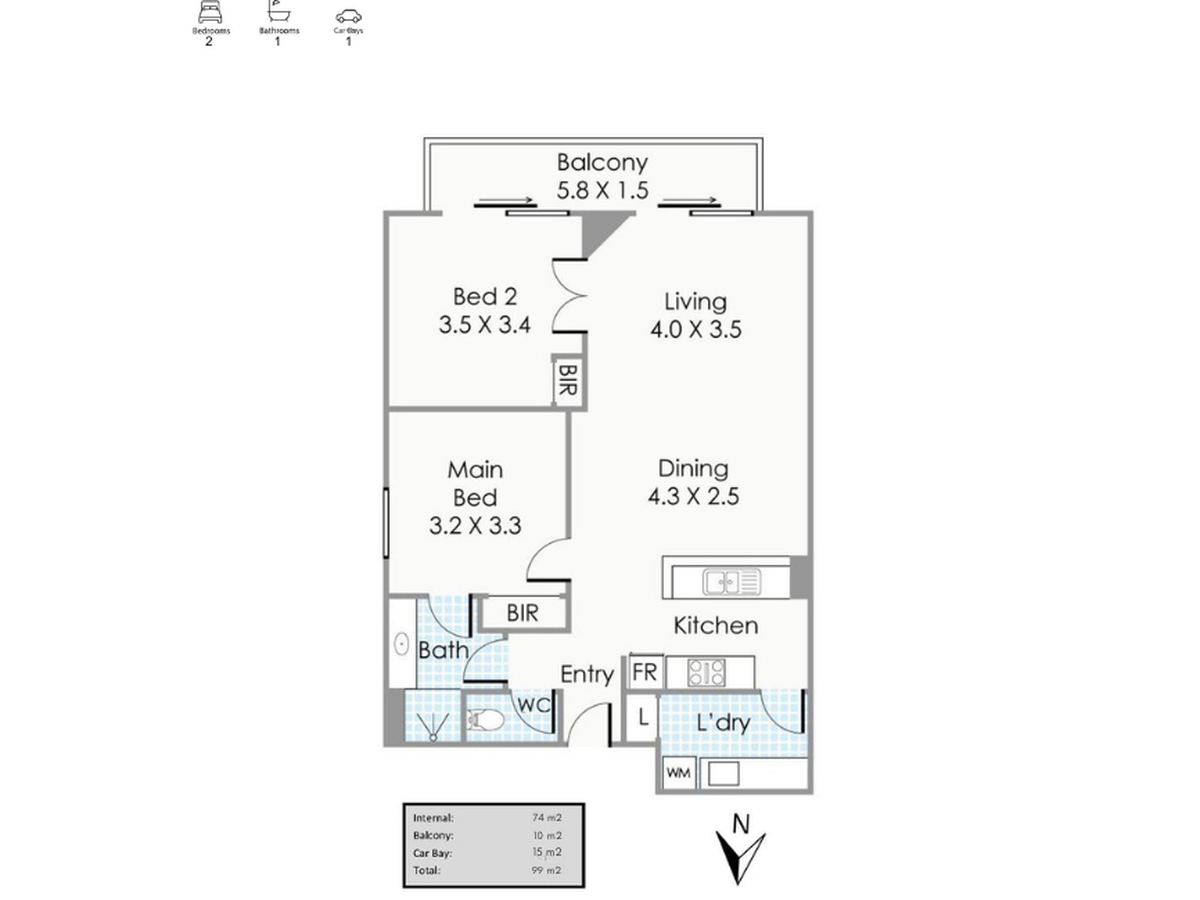 - Internal: 74sqm | Balcony: 10sqm | Cars: 15sqm | Total: 99sqm