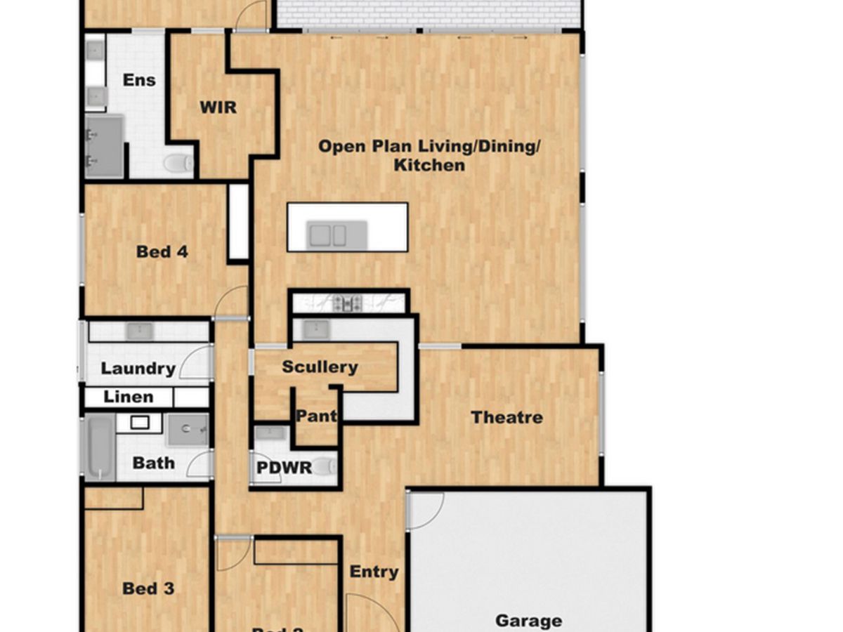 - Engineered stone benchtops in kitchen(waterfall edges for island), bathrooms and laundry