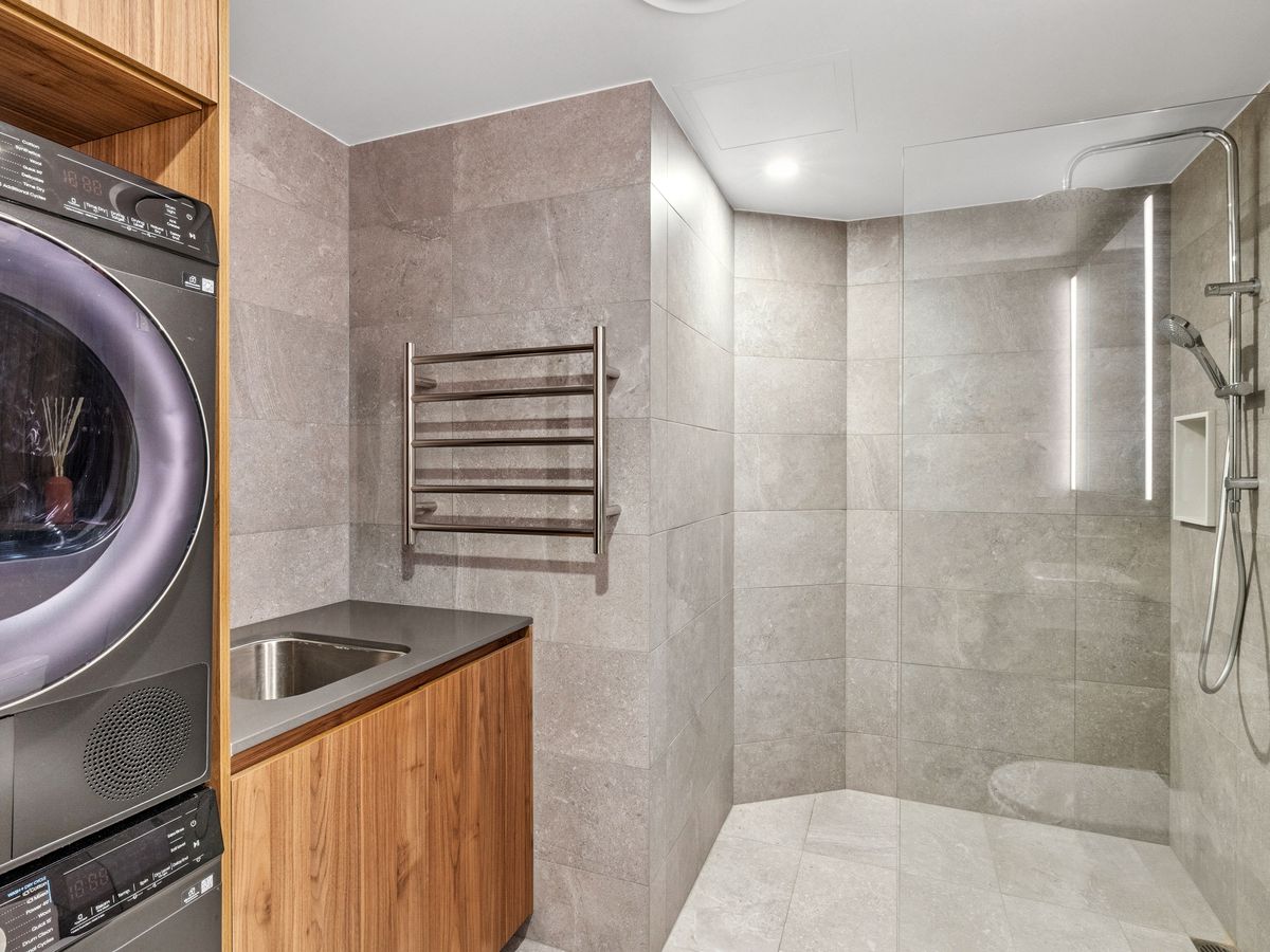 - Bathroom/Laundry tiled to ceiling with hob-less showers, washer & dryer and built in storage + heated towel racks
