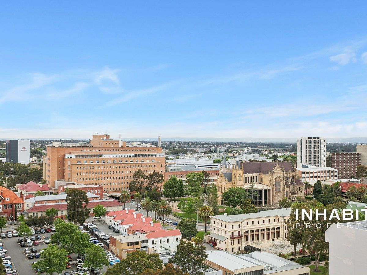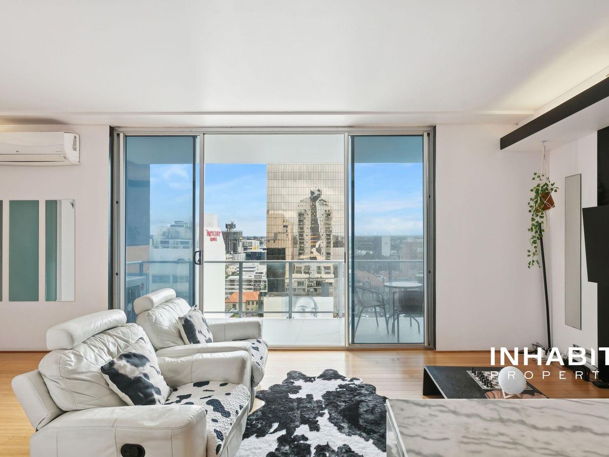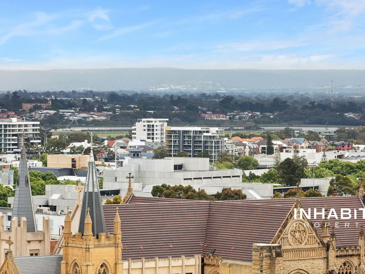 Poised high above Perth's glittering cityscape, this refined residence on St Georges Terrace embodies the essence of sophisticated urban living. Step inside and be greeted by an atmosphere of quiet luxury, where wooden flooring flows beneath high ceilings and light dances through the north-facing expanse. The living area unfolds toward vast windows that frame captivating views of St Mary's Cathedral, the Westin Hotel, and the ever-changing hues of the city skyline.