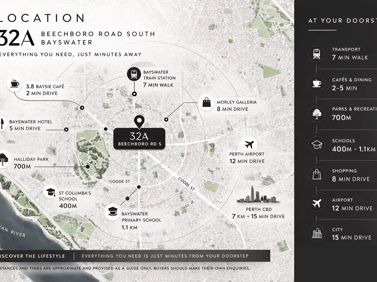 Enjoy a 7-minute walk to Bayswater Train Station, morning coffee at nearby cafés, and relaxing walks through Halliday Park just 700m away. Families will appreciate being close to St Columba's School (400m) and Bayswater Primary School (1.1km), while Morley Galleria is only 8 minutes away for shopping and entertainment.
